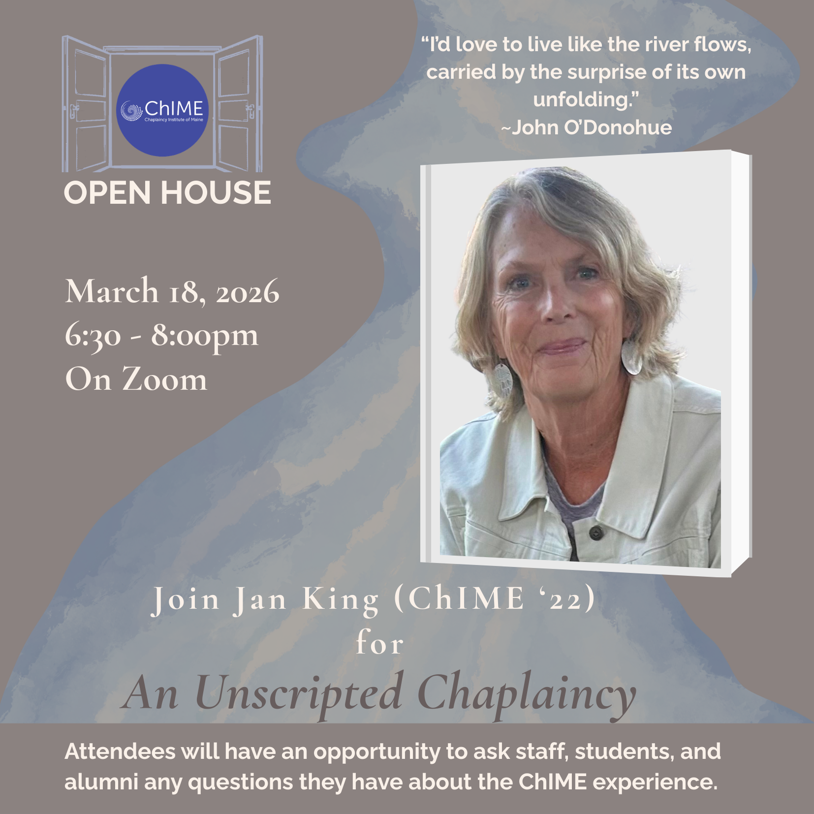 In this alum-led talk, Jan King reflects on the words of John O’Donohue quoted at the end of her ordination speech in 2022 and how the surprising rhythm of the river continues to shape her unscripted life and ministry. Jan will also share how her journey on the path of Universal Sufism has made room for a balance of activity and repose, for the practice of silence, and a spaciousness to follow her unique path as she lives and serves.